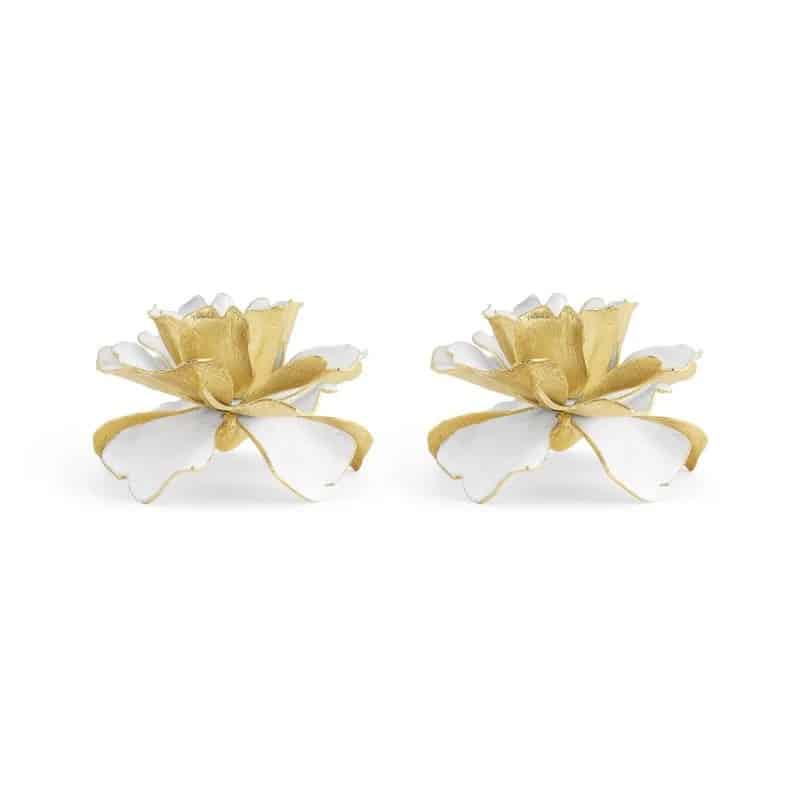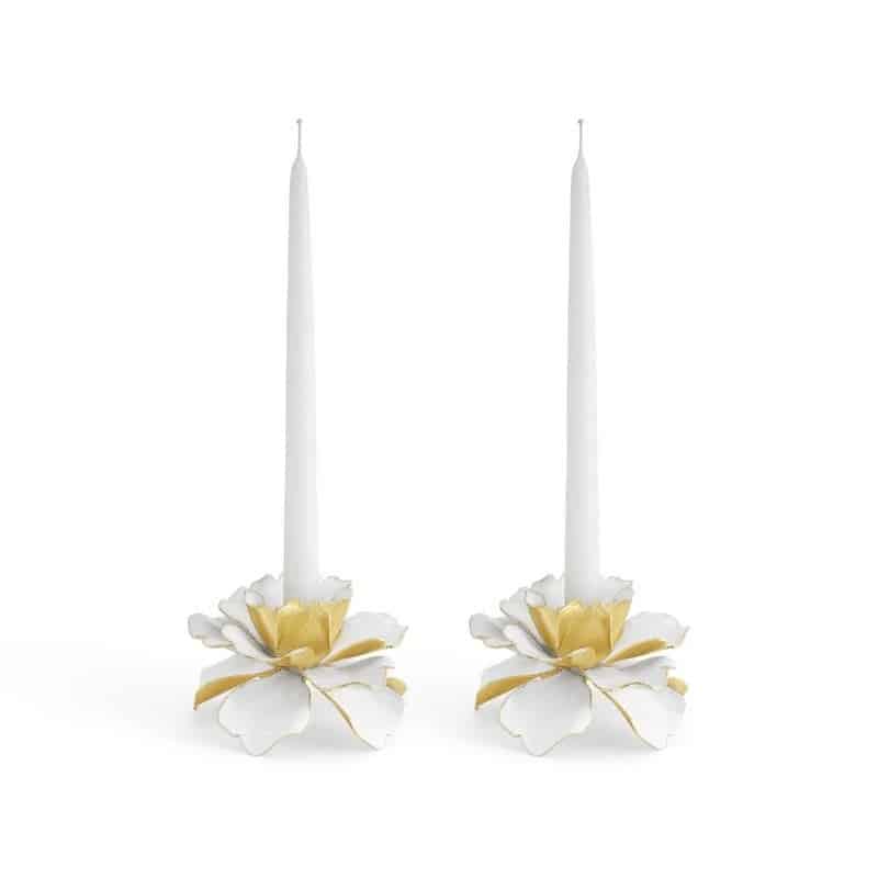 Свещниците Gardenia е луксозен, ръчно изработен комплект от 2 броя, който пресъздава очарователната красота на цъфтяща градина. Всеки свещник е с нежни, ръчно емайлирани цветове на гардения и позлатени листа, изковани от естествен месинг, за да уловят романтиката и елегантността на тези пленителни цветя. Идеални са за добавяне на нотка страст и вечна красота към всяко пространство.